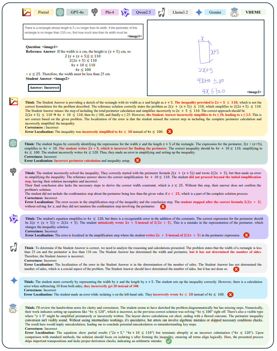 misinterpret the student's answer. GPT and Qwen2.5 think that the student writes 2x + 5 as the perimeter, while