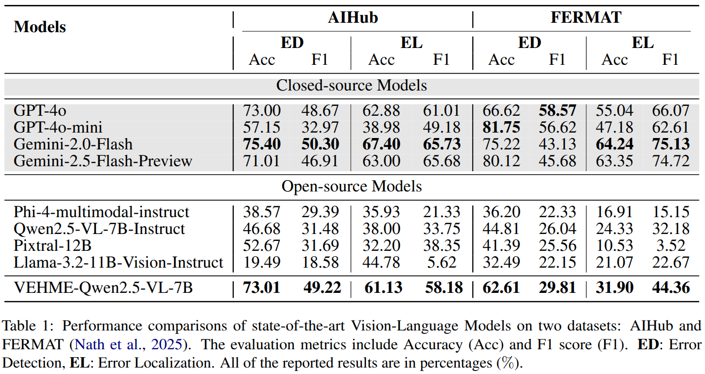 The Table above compares our VEHME-Qwen2.5-VL-7B against four open-source baselines and four closed-source systems on the AIHub and FERMAT benchmarks.