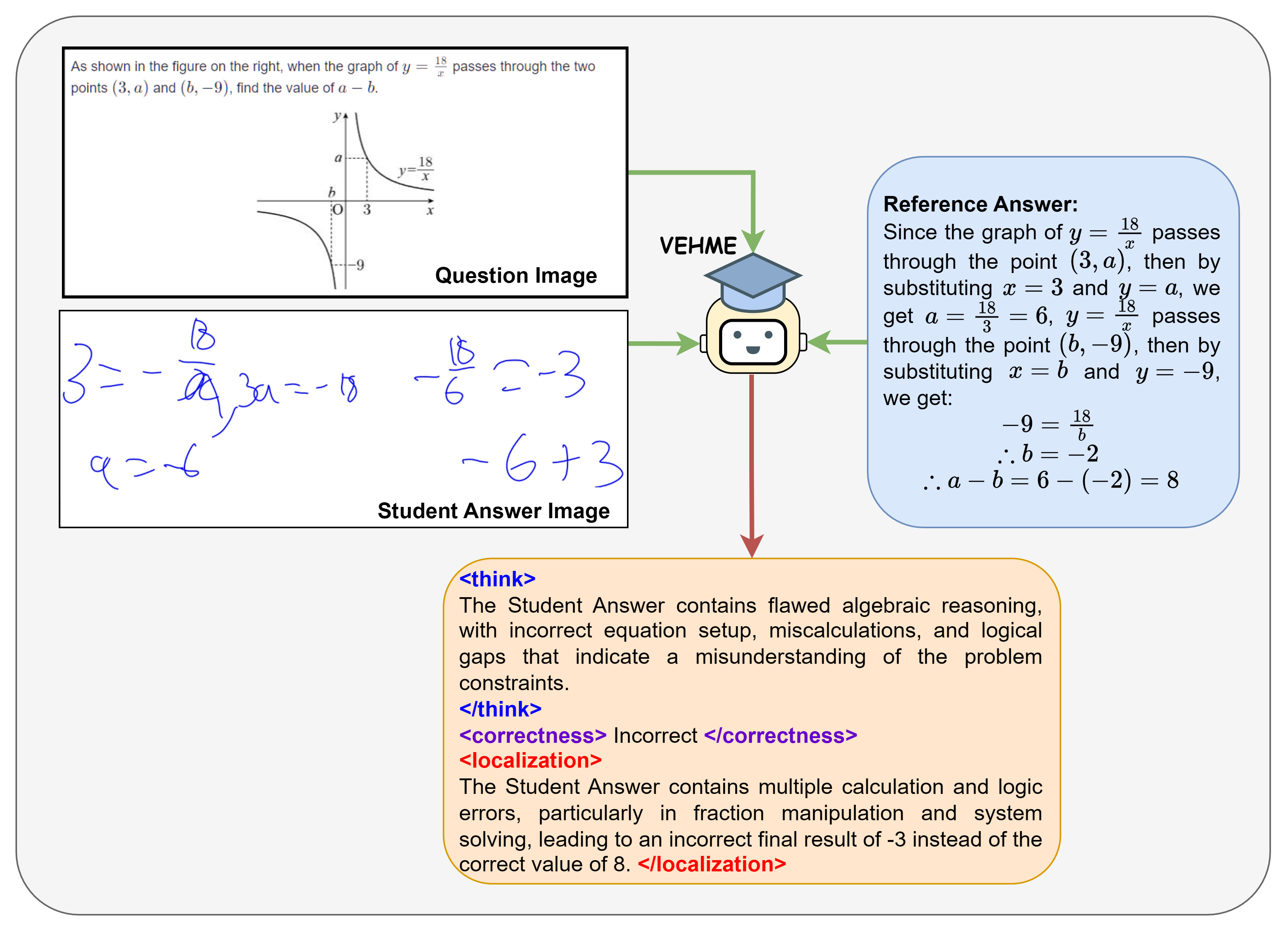 Automatically assessing handwritten mathematical solutions is an important problem in educational technology with practical applications, but it remains a significant challenge due to the diverse formats, unstructured layouts, and symbolic complexity of student work. To address this challenge, we introduce VEHME-a Vision-Language Model for Evaluating Handwritten Mathematics Expressions—designed to assess open-form handwritten math responses with high accuracy and interpretable reasoning traces. VEHME integrates a two-phase training pipeline: (i) supervised fine-tuning using structured reasoning data, and (ii) reinforcement learning that aligns model outputs with multi-dimensional grading objectives, including correctness, reasoning depth, and error localization. To enhance spatial understanding, we propose an Expression-Aware Visual Prompting Module, trained on our synthesized multi-line math expressions dataset to robustly guide attention in visually heterogeneous inputs. Evaluated on AIHub and FERMAT datasets, VEHME achieves state-of-the-art performance among open-source models and approaches the accuracy of proprietary systems, demonstrating its potential as a scalable and accessible tool for automated math assessment. Our training and experiment code is publicly available at our GitHub repository.